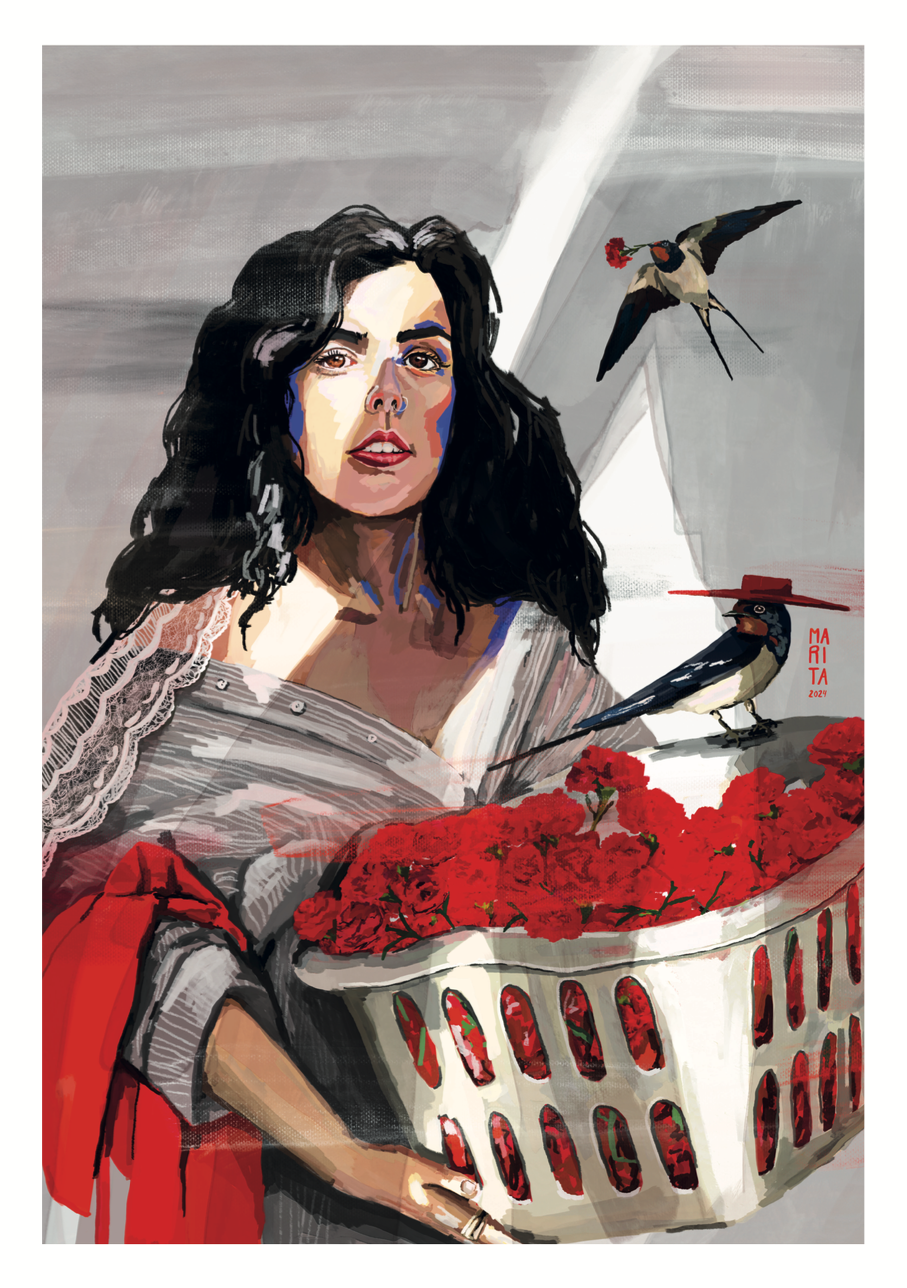 Ilustração de mulher com flores vermelhas numa cesta branca e pássaros no fundo cinzento