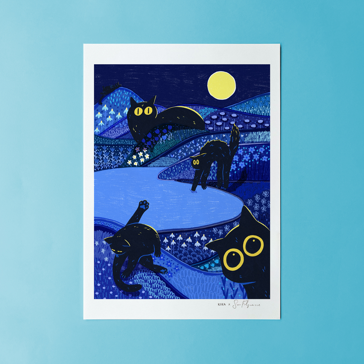 Nesta ilustração, descobrimos como são as noites nas Furry Mountains. Paisagem ilustrada por KIKA e gatos ilustrados por Sara Felgueiras.