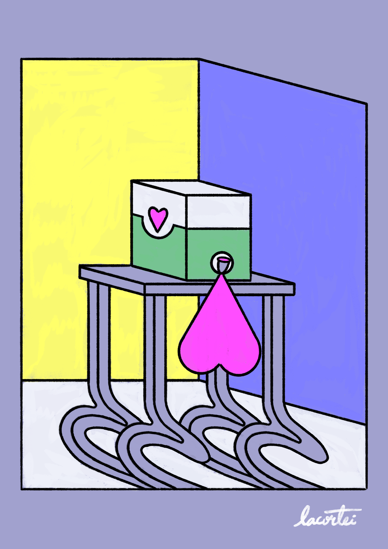 Caixa dispensadora branca e verde numa mesa cinzenta com pernas onduladas e gota cor-de-rosa