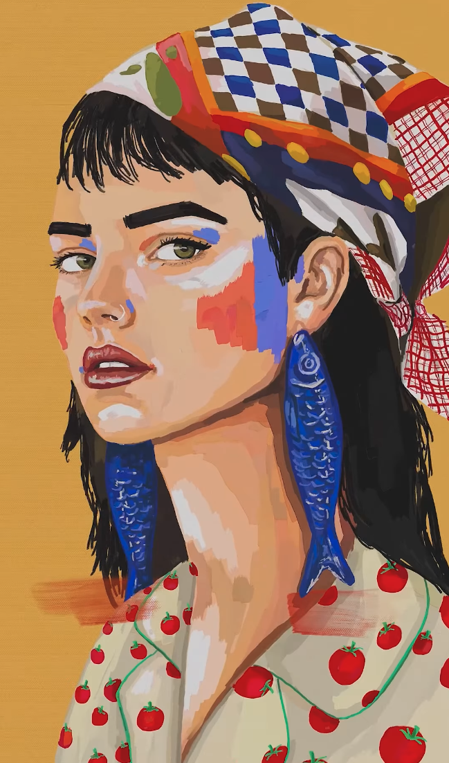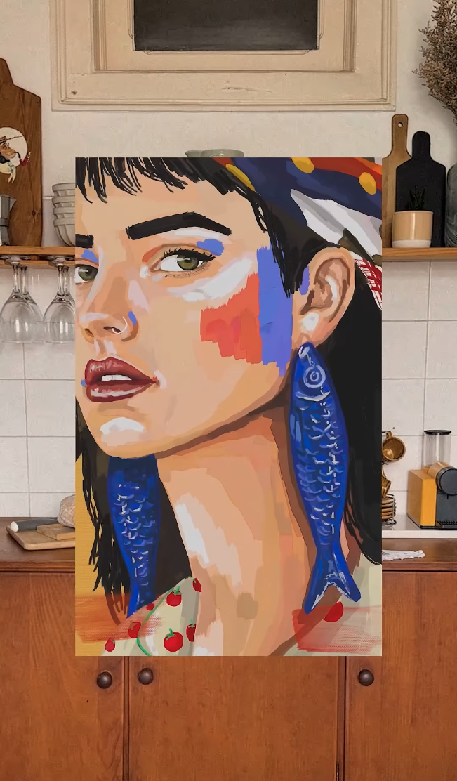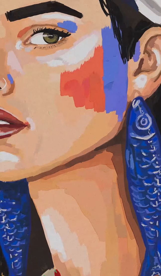 • Pintura estilizada de mulher com brincos azuis em forma de peixe