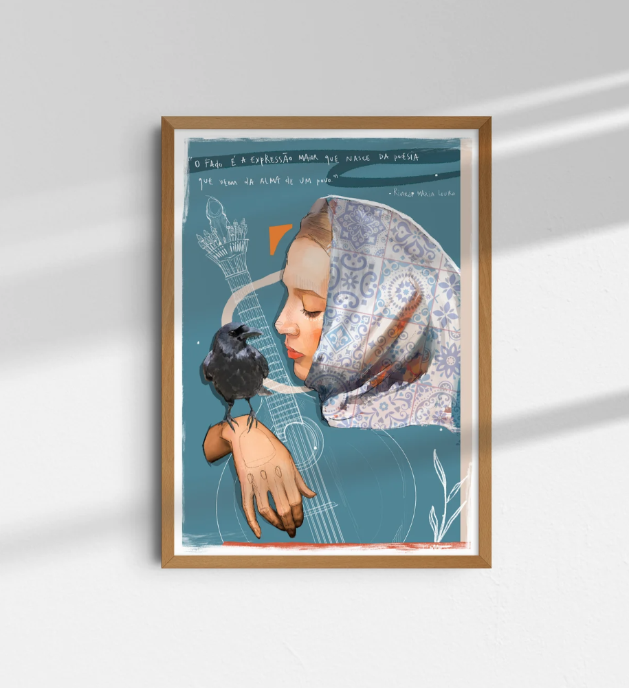 • Poster artístico com mulher de lenço e pássaro, fundo azul e texto em português.