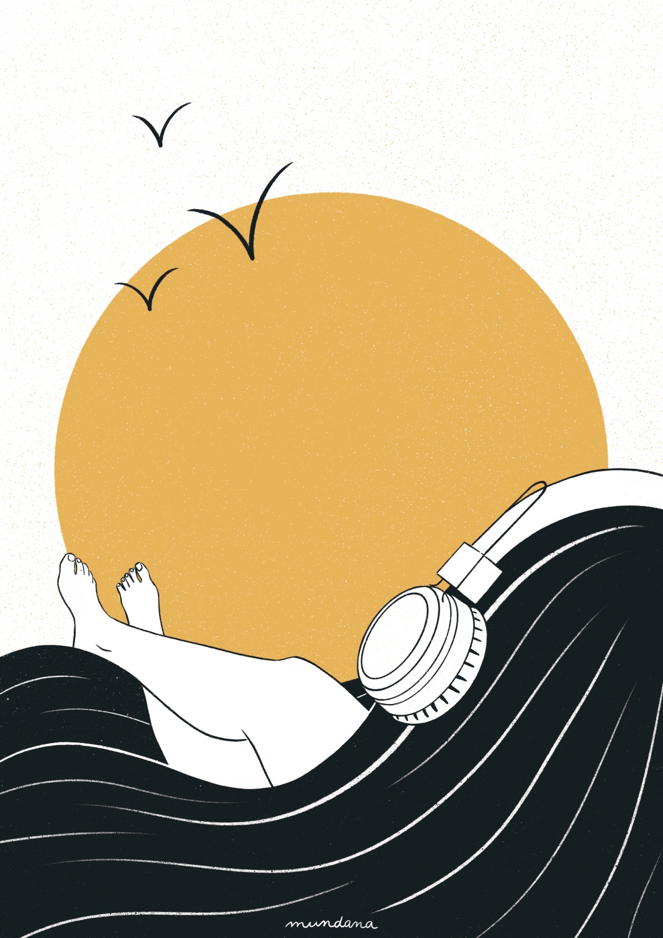 • Ilustração de pernas com auscultadores e ondas negras com fundo laranja.