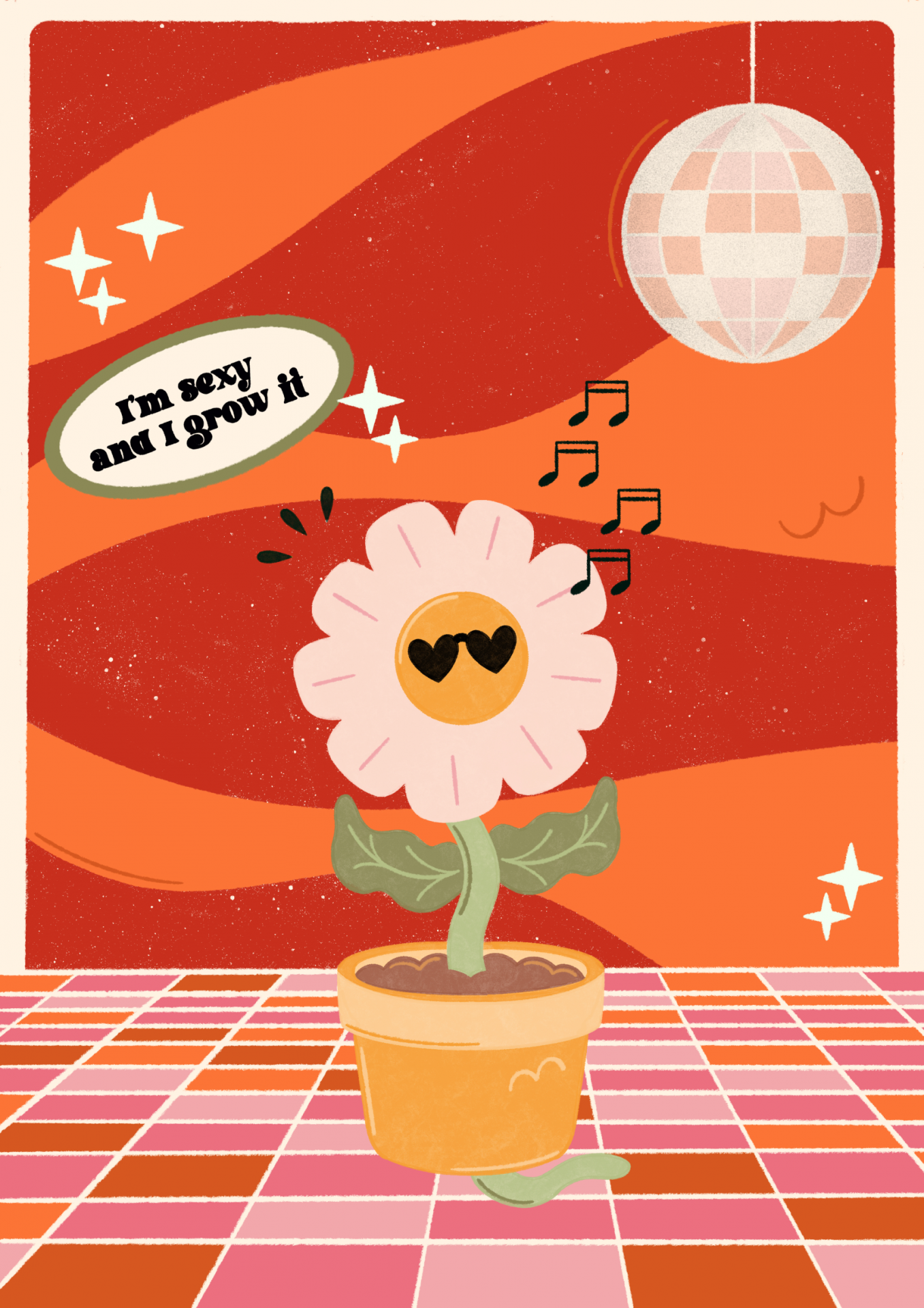 Ilustração de flor animada num vaso com texto divertido e disco de discoteca ao fundo