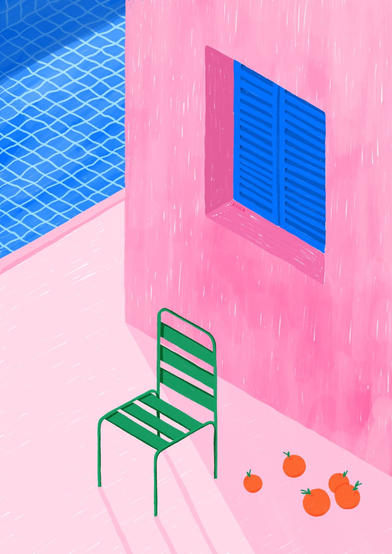 • cadeira metálica verde junto a parede rosa com janela azul e laranjas no chão