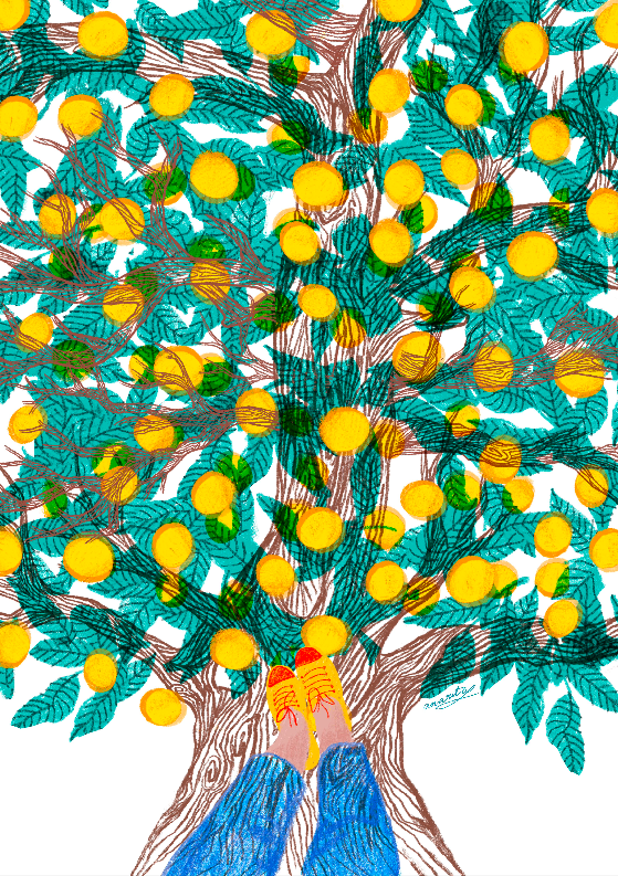 • Ilustração de uma árvore com frutos amarelos e pernas humanas calçando sapatos amarelos