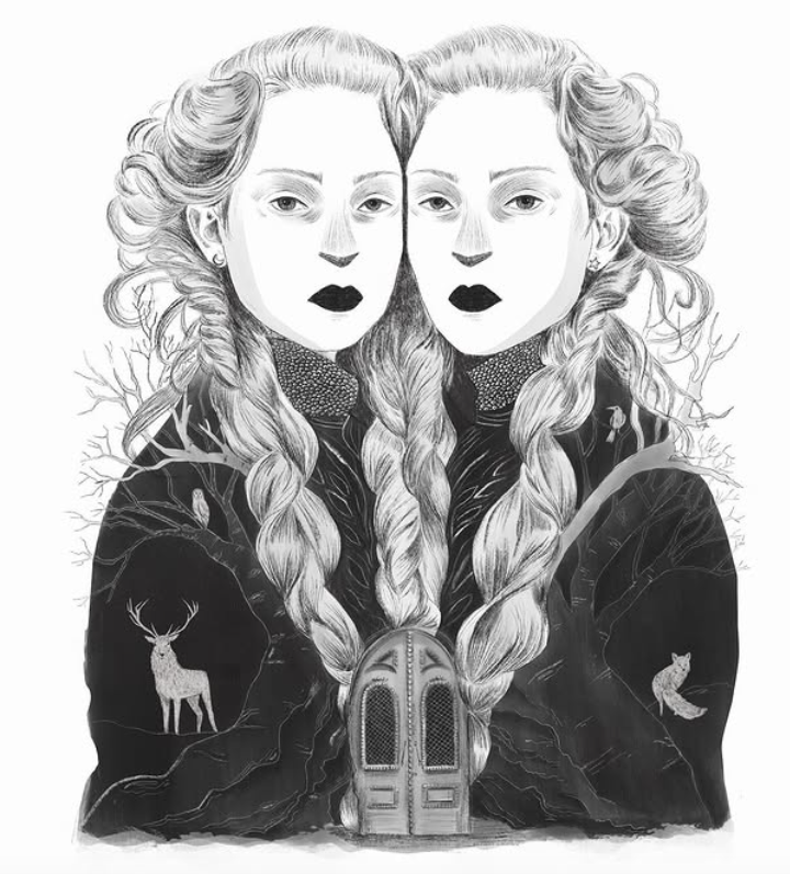 Desenho a preto e branco de duas mulheres com cabelos trançados e casacos com desenhos de veado e pássaro