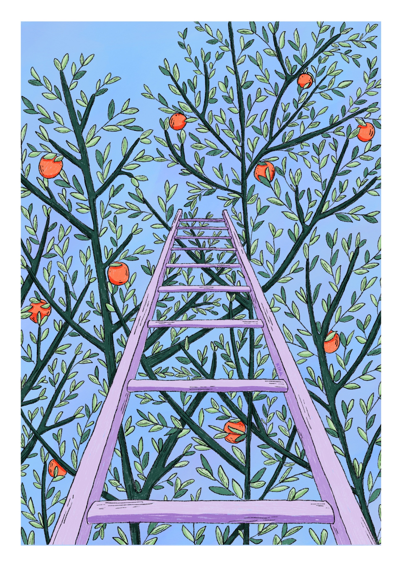 • Escada cor-de-rosa e ramos de árvore com frutos vermelhos num céu azul claro