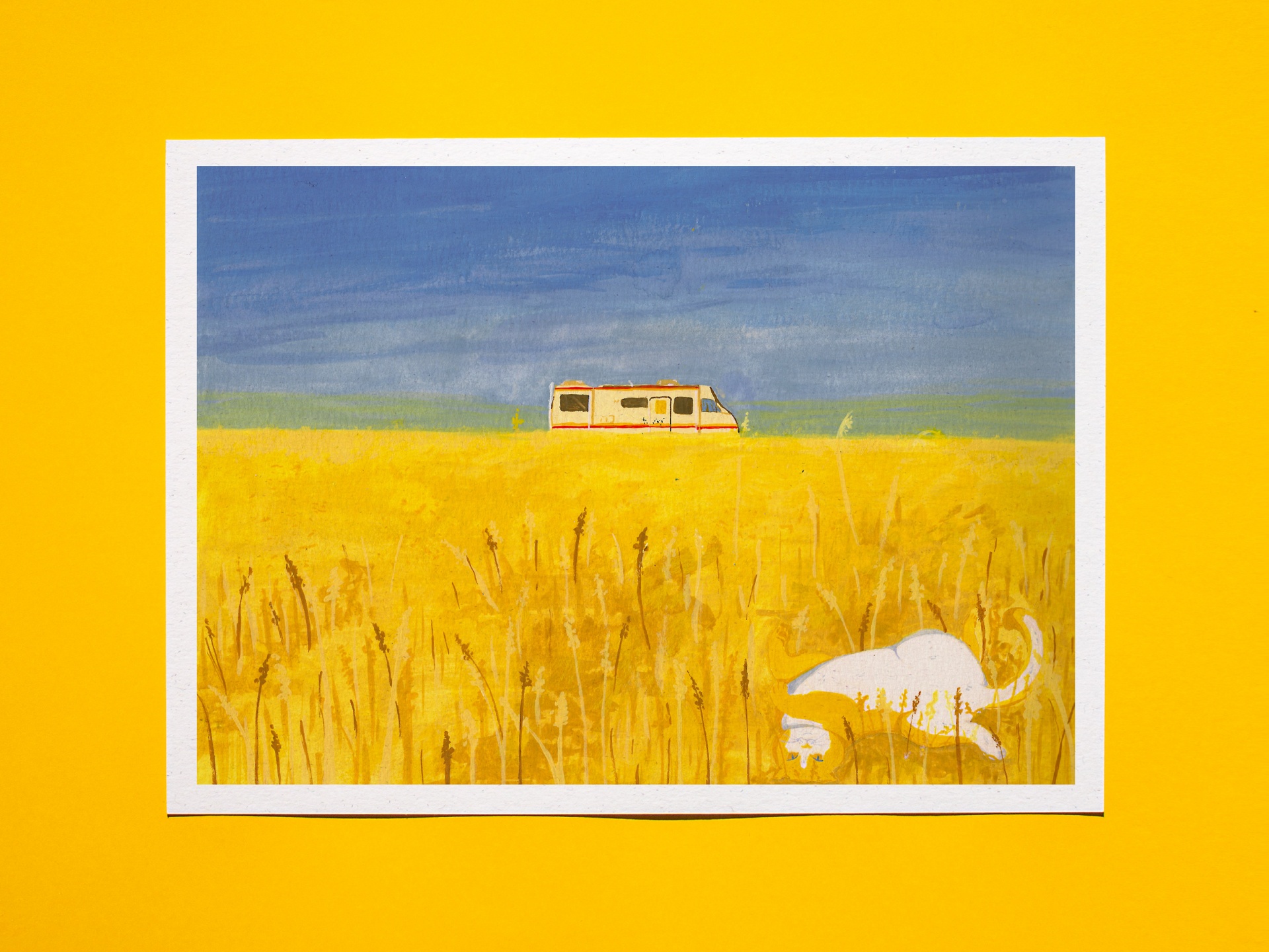 • Pintura ou fotografia com campo de trigo dourado, céu azul, autocaravana amarela ao fundo e gato branco em primeiro plano
