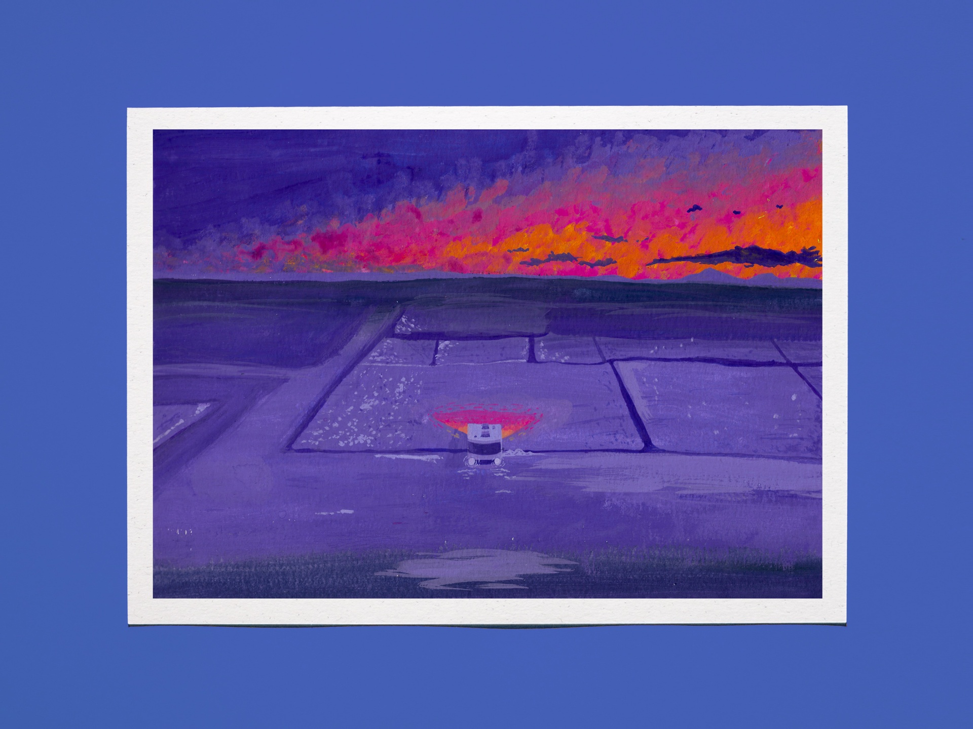 • pintura de paisagem ao entardecer com céu colorido e luz vermelha