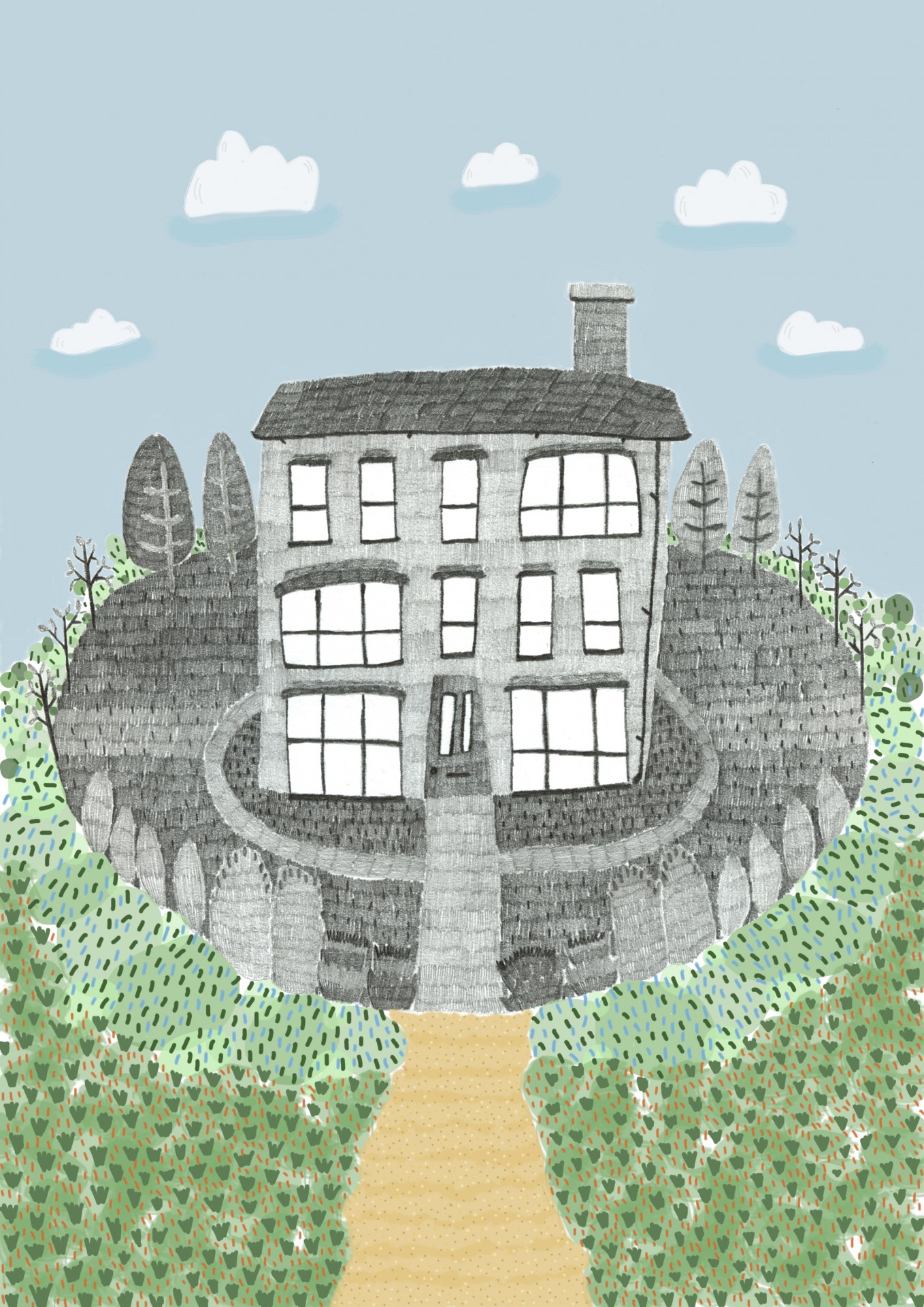 Desenho de casa cinzenta rodeada por muro e vegetação com céu azul e nuvens.