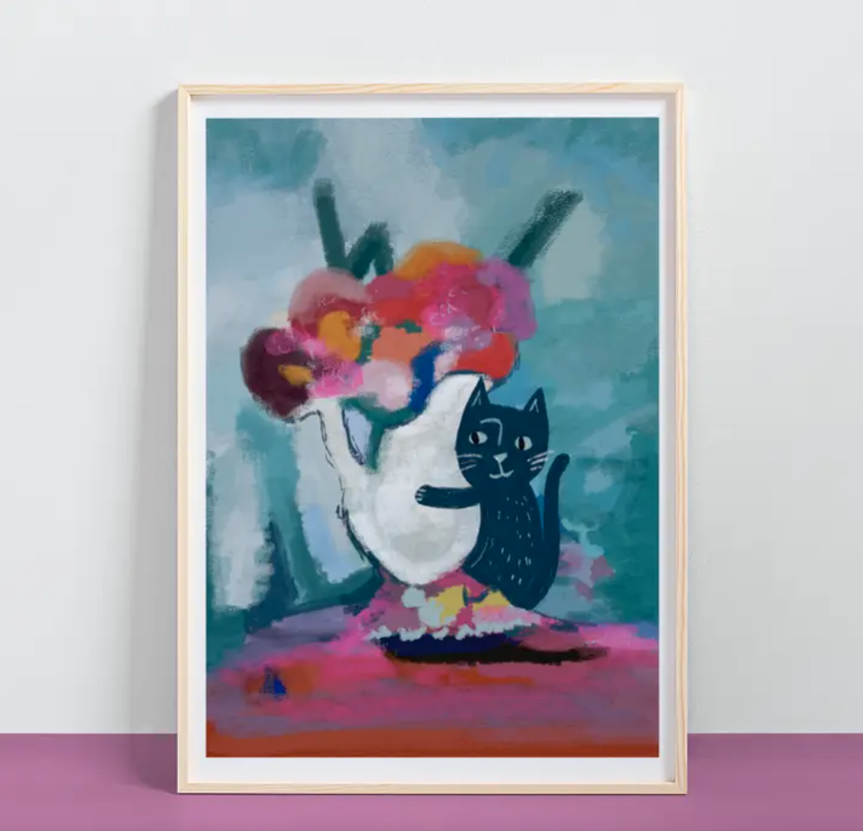The 'Cats in Art' print is a feline reimagining of some of the greatest artworks of all time. Purr-fect wall art for cat and art lovers alike. Inspired by the work of the artist 'Henri Matisse'. This print is a fun whisker twisting take on his artwork, now reimagined as 'Catisse'