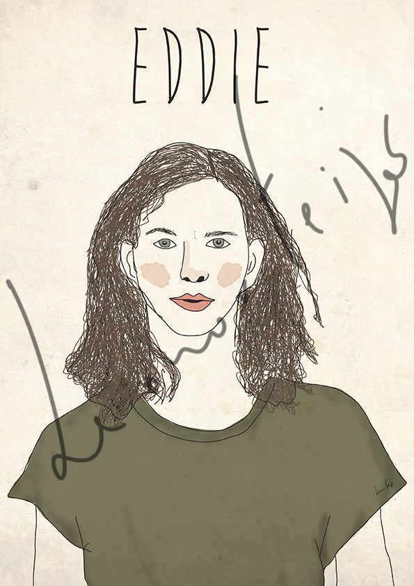 Desenho digital de mulher com t-shirt verde e texto EDDIE