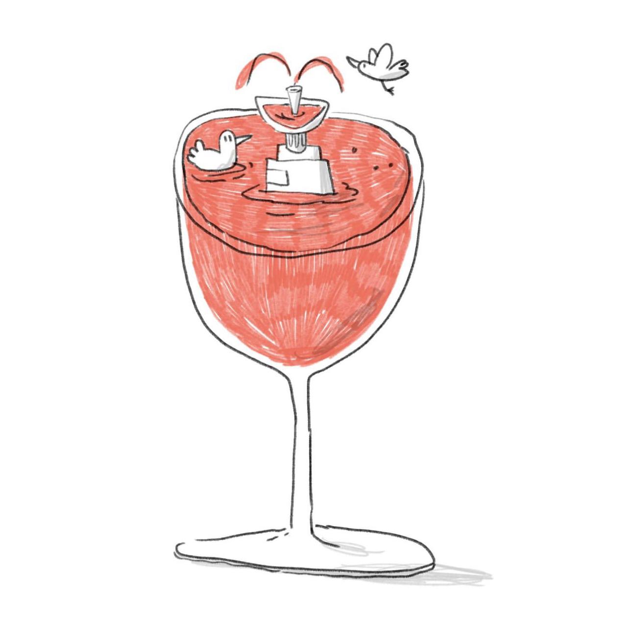 • Copo grande com líquido vermelho e fonte com patinhos brancos