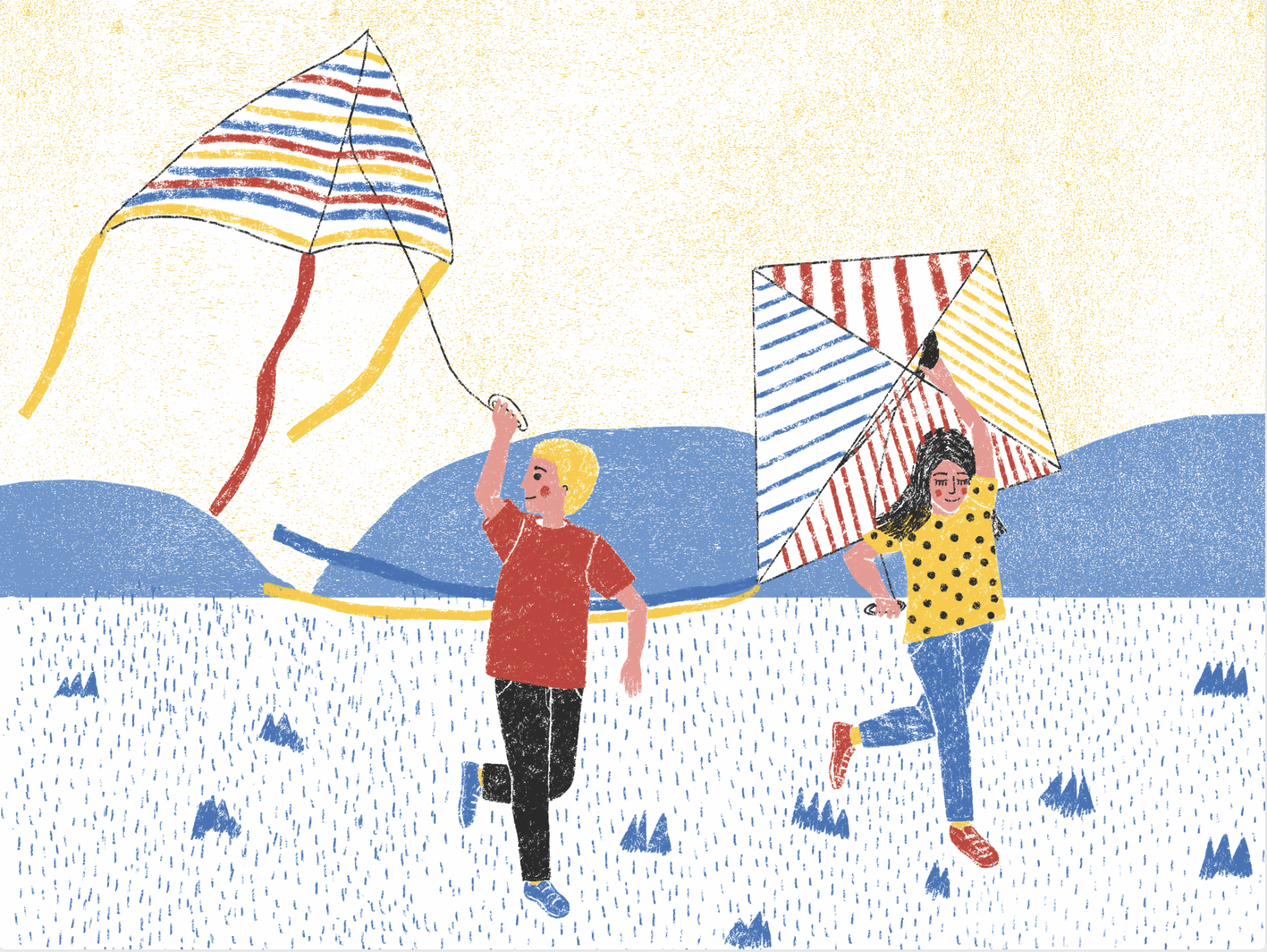 • Crianças a brincar com papagaios coloridos nas riscas ao ar livre