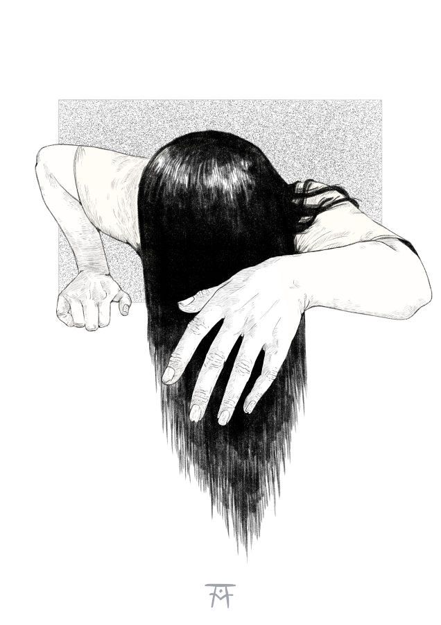 • Desenho a preto e branco de pessoa com cabelo comprido e liso e mãos estendidas