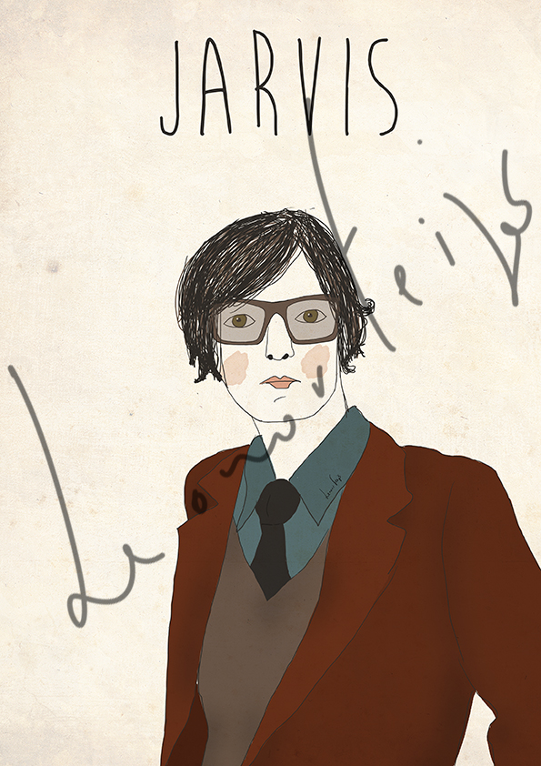 Ilustração de uma pessoa de cabelo castanho com óculos, gravata preta e casaco castanho, texto Jarvis no topo