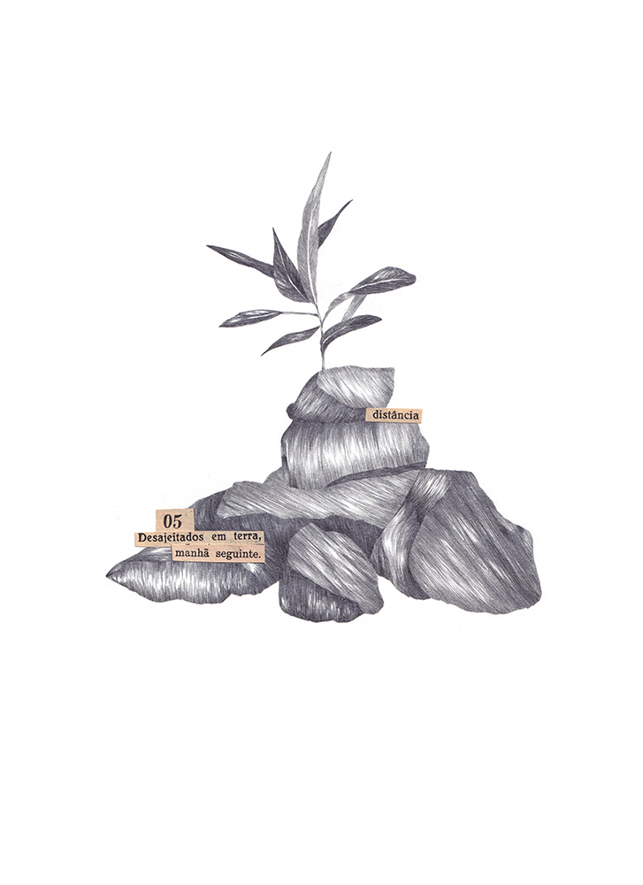 • Desenho preto e branco de pedras e planta com textos recortados em português