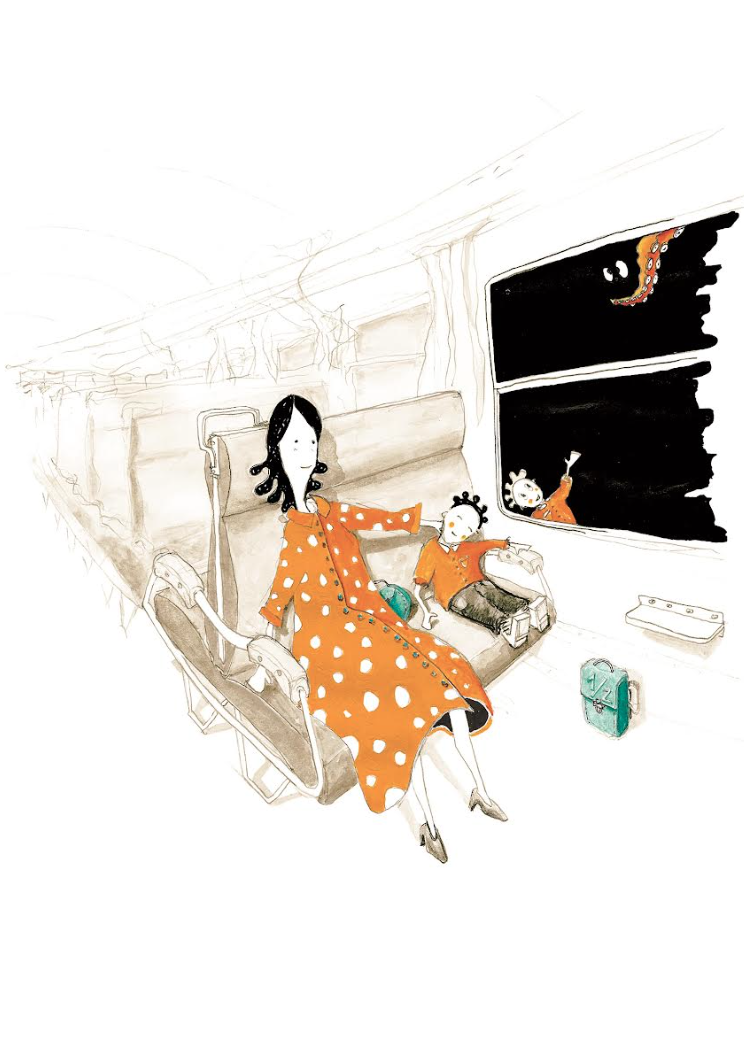 Ilustração de mulher e criança sentados num banco de comboio com polvo visível na janela.