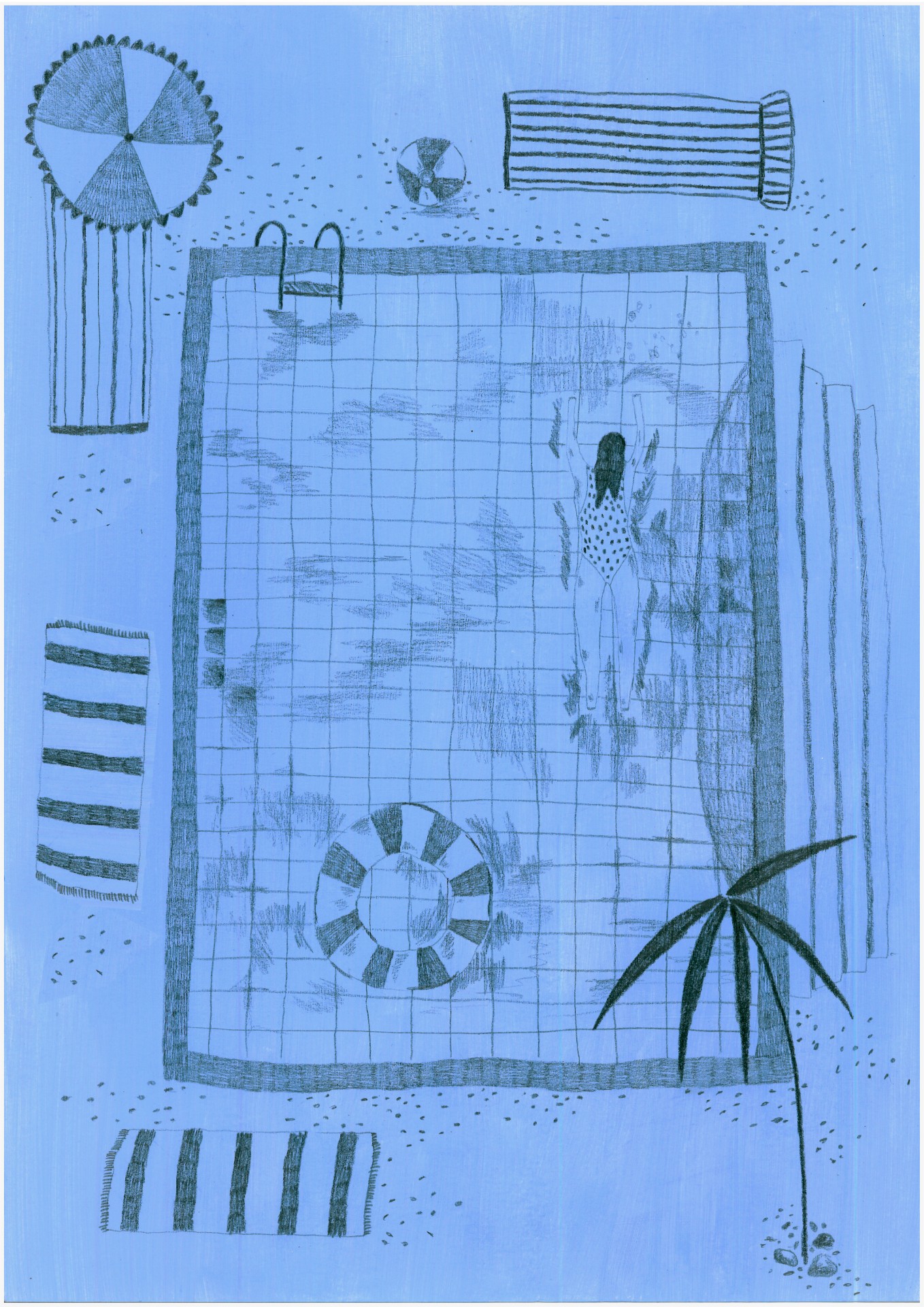 • Desenho de uma piscina retangular com nadadora, bóia, toalhas riscas, guarda-sol e palmeira, em tons de azul