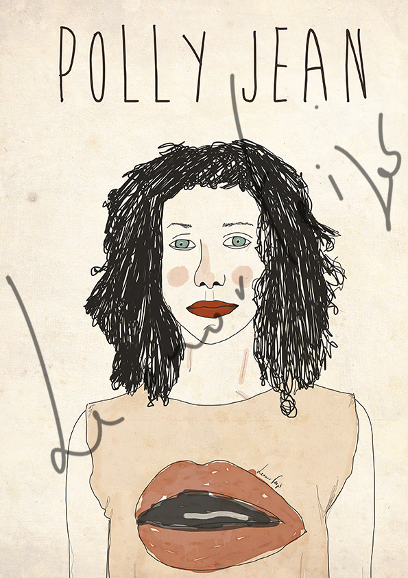 Ilustração de mulher com cabelo escuro e t-shirt bege com estampa de lábios e texto POLLY JEAN
