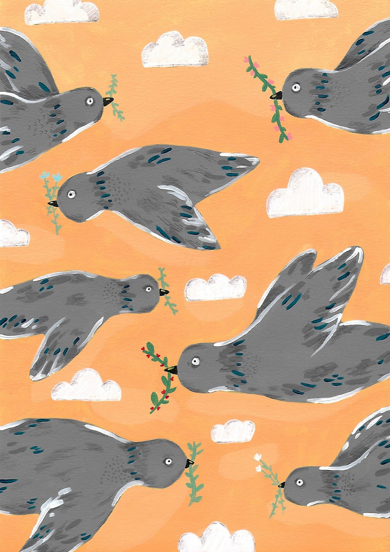 • Padrão de pombas cinzentas com ramos verdes voando sobre fundo laranja com nuvens brancas