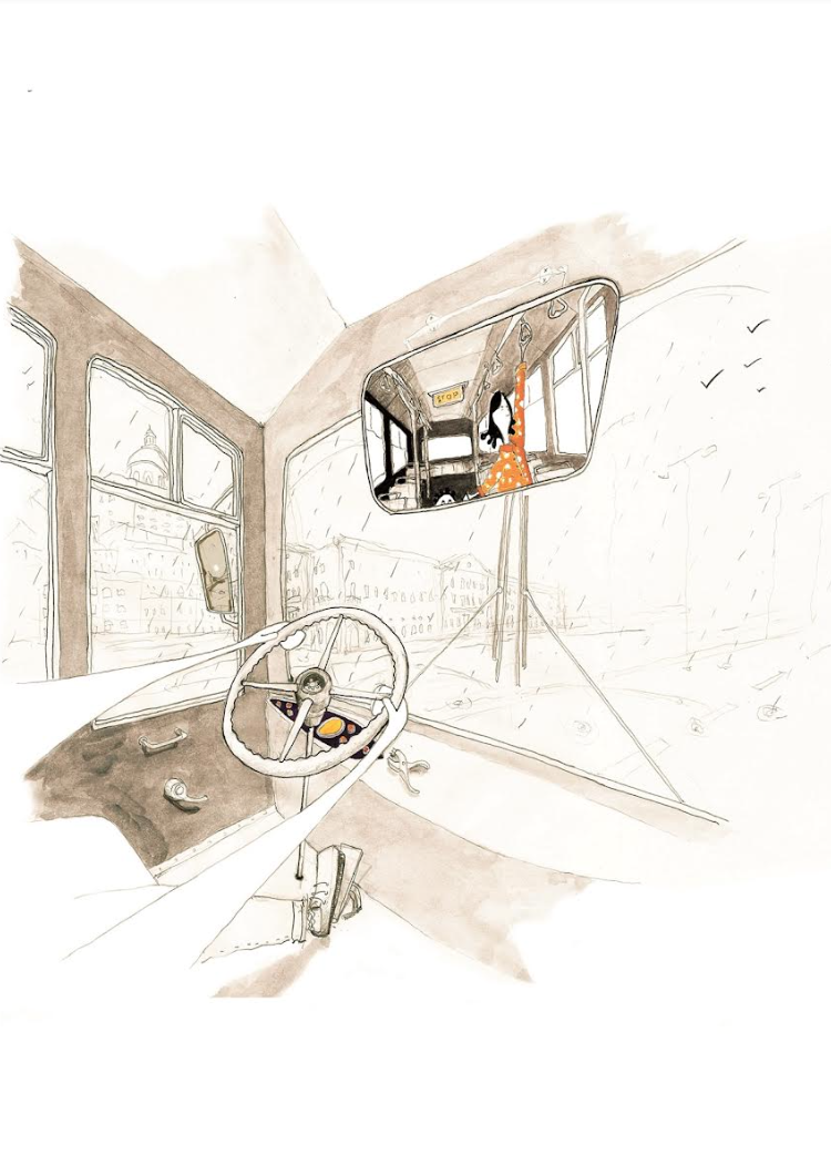 Interior de carro vintage com volante e espelho retrovisor refletindo figura feminina em vestido laranja