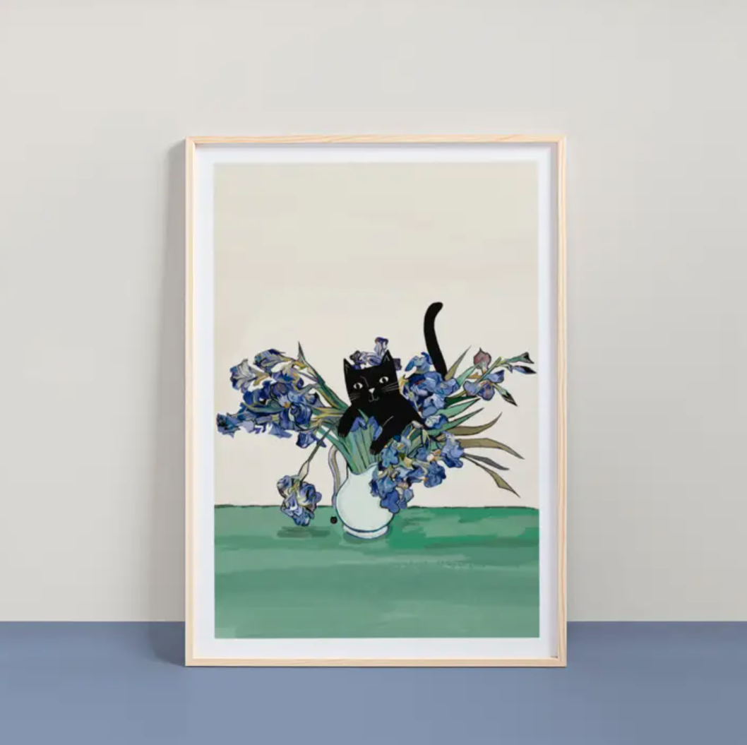 This print is a fun whisker twisting take on his artwork reimagined as 'Vincat's Irises' Combining a love of cats and a passion for art, illustrator and designer Nia Gould (‘Niaski’) has created a punny print range celebrating the life and times of artistic felines.