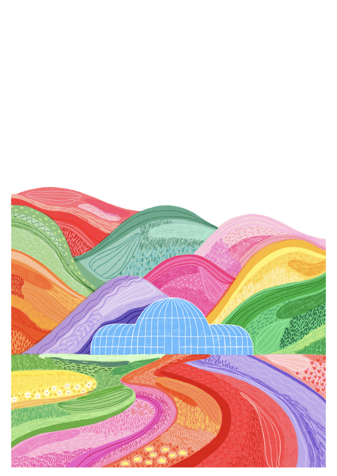 • Ilustração de edifício azul com colinas coloridas ao redor