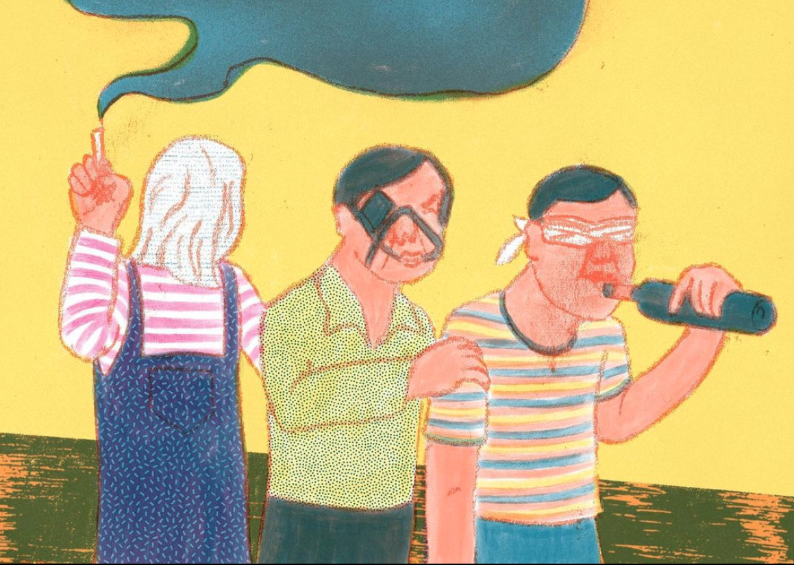 Ilustração colorida de três pessoas com estilos variados, uma de costas e duas de frente, uma bebida de uma garrafa.