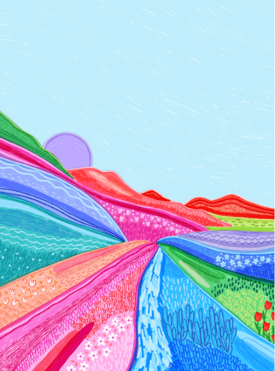Ilustração de campos floridos coloridos sob um céu claro com sol ou lua lilás
