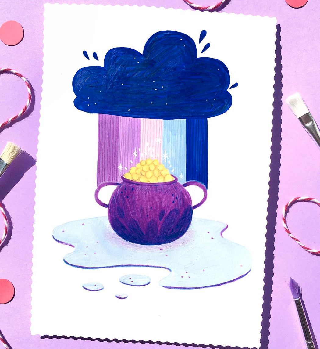 • Desenho de nuvem azul e pote roxo com bolinhas amarelas em papel sobre superfície lilás