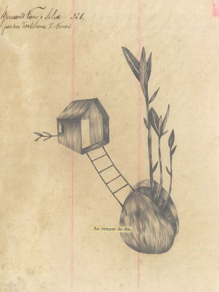 • Desenho de casa em madeira com escada ligando a base arredondada com plantas, texto manuscrito e frase 'Ao romper do dia'.