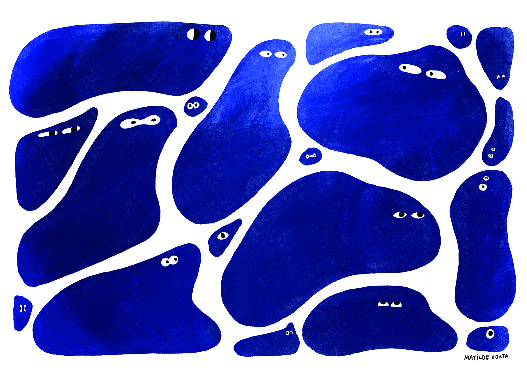 • Formas abstratas azuis com olhos desenhados num fundo branco.