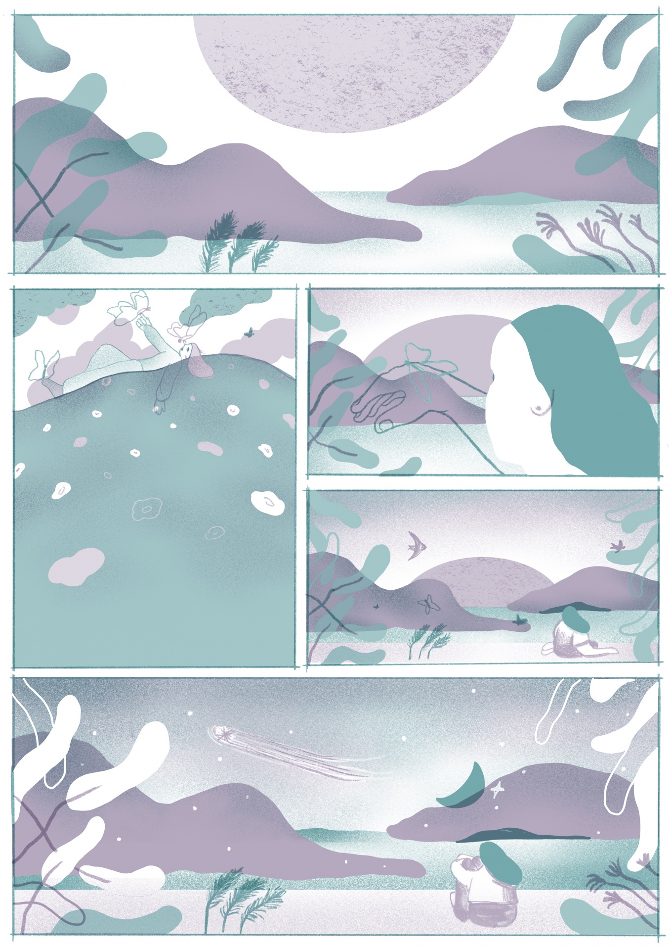 • Banda desenhada com paisagem natural e figura humana em tons lilás e verde-azulado