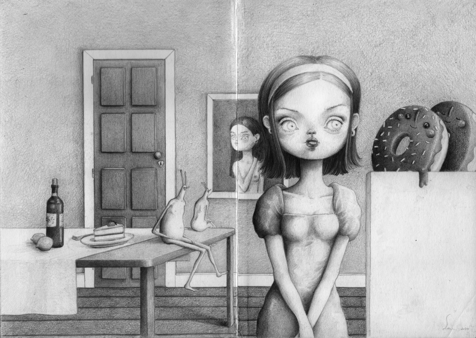 • Ilustração a preto e branco de uma rapariga com olhos grandes num interior com mesa, garrafa, copos, figuras sentadas e esculturas