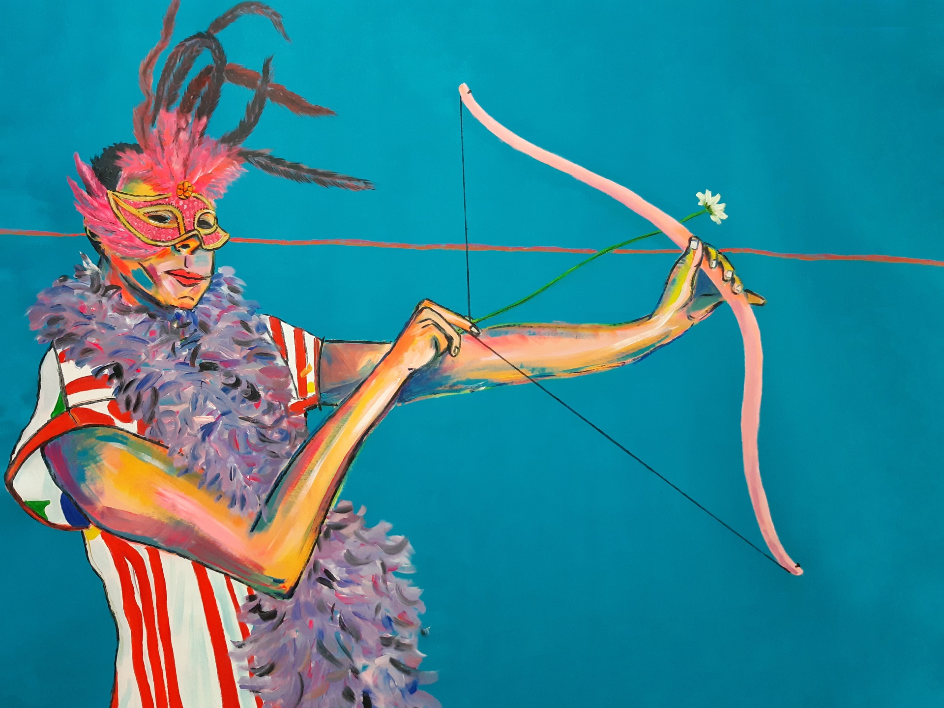 "After" - recriação do retrato de um amigo, através do registo fotográfico de um momento que, ao meu olhar, caracteriza por completo a essência deste Ser. A figura apresenta-se disfarçada do que normalmente a pessoa veste no seu dia a dia, mas a vestimenta e adereços trabalhados na pintura representam a sua personalidade e o seu universo interior. Trata-se de uma "máscara" que ao invés de mascarar, decide aqui expor e apresentar a verdade deste Ser - é como se virássemos a máscara do seu avesso e deixássemos as suas "fragilidades", escondidas, brilharem e libertarem-se. Claramente podemos fazer uma ligação da imagem ao imaginário do carnaval, devido à representação das vestes e adereços compostos, apesar de o registo não ter sido criado a pensar nessa época mas sim num momento festivo onde esta pessoa celebra livremente, sem repressão e julgamentos, o Ser maravilhoso que é e exterioriza naturalmente o seu lado mais selvagem - a sua natureza. O objecto Flexa fala por si perante o lançamento de uma flor, símbolo de esperança e libertação.