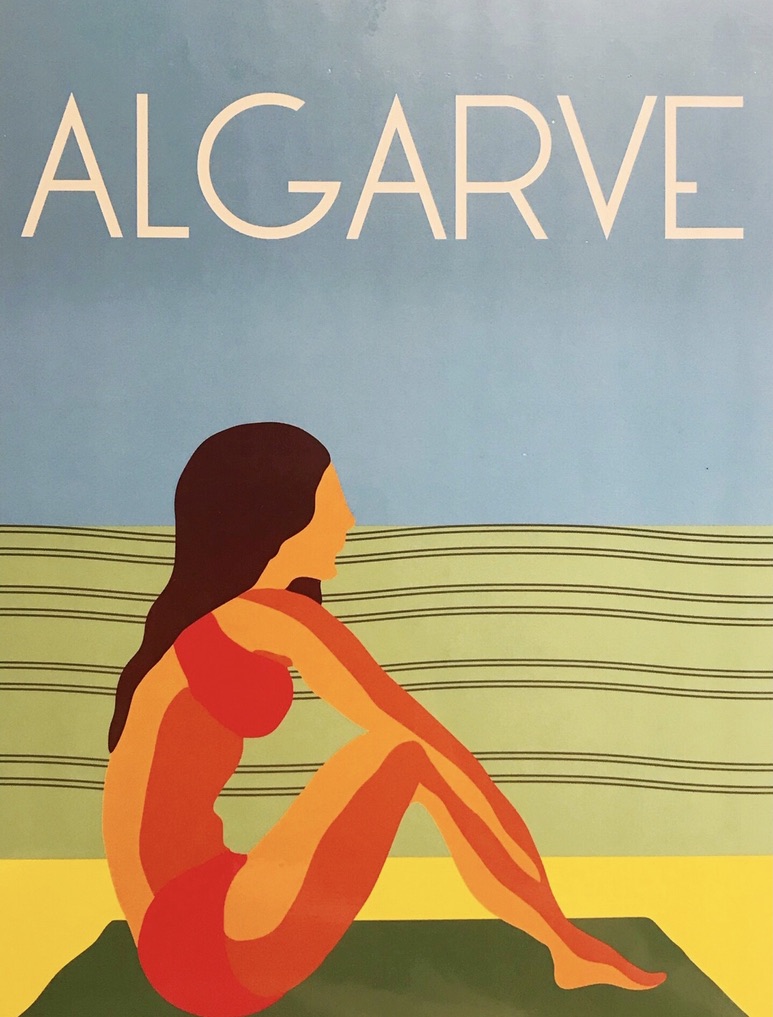 • Cartaz ilustrativo com mulher em biquíni vermelho sentada e texto ALGARVE