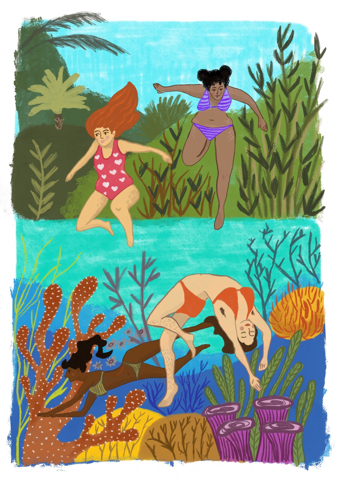 Ilustração colorida de pessoas a mergulhar em ambiente aquático com plantas e corais