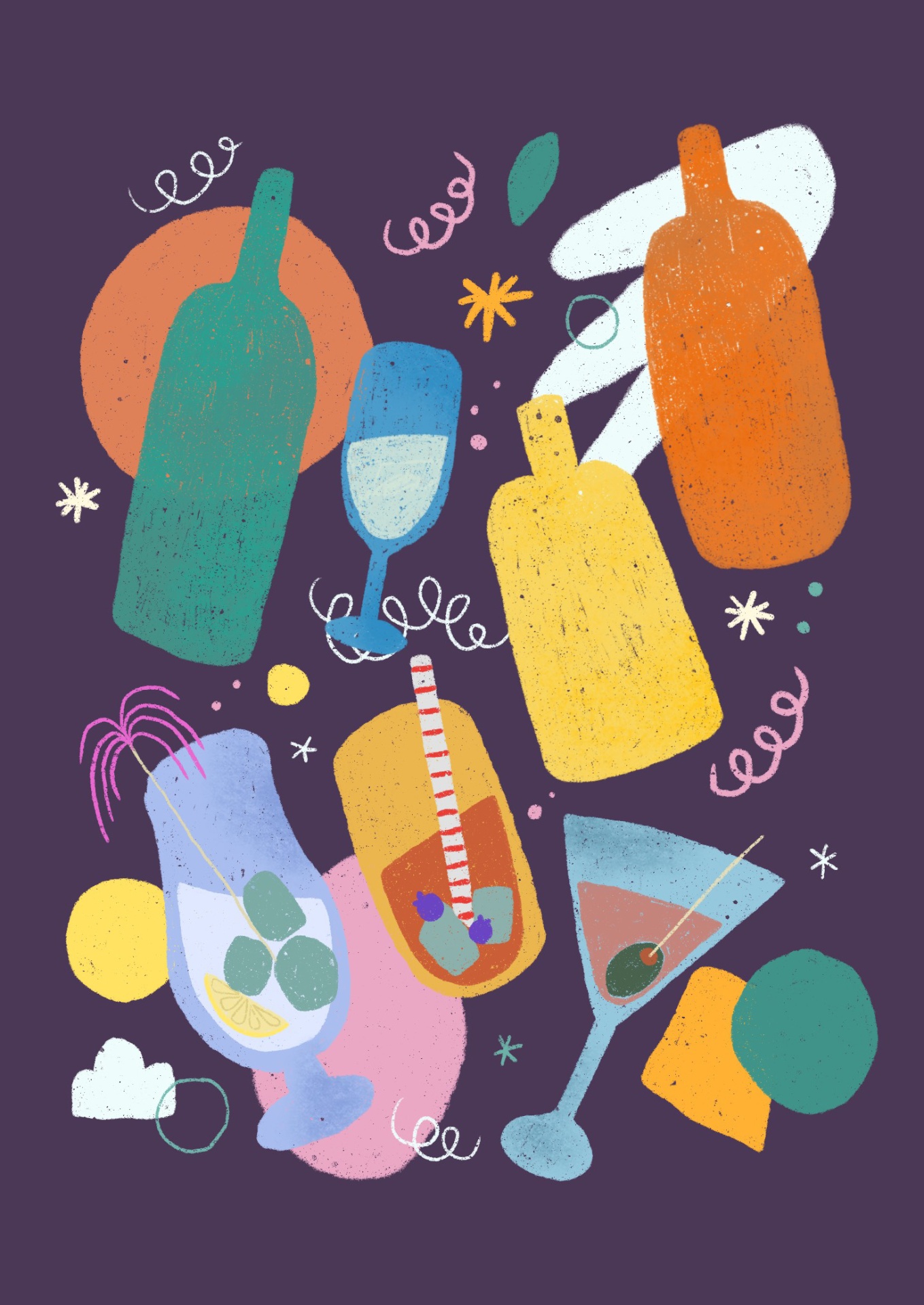 • Ilustração colorida de garrafas e copos sobre fundo roxo com elementos decorativos