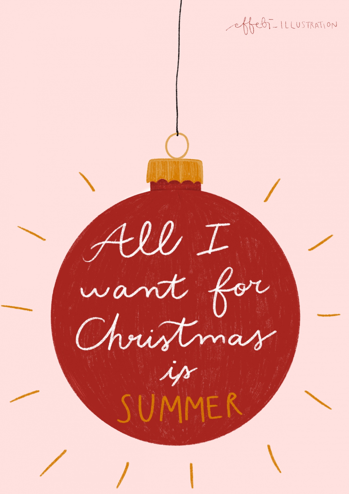 • Bola de Natal vermelha com texto 'All I want for Christmas is SUMMER'