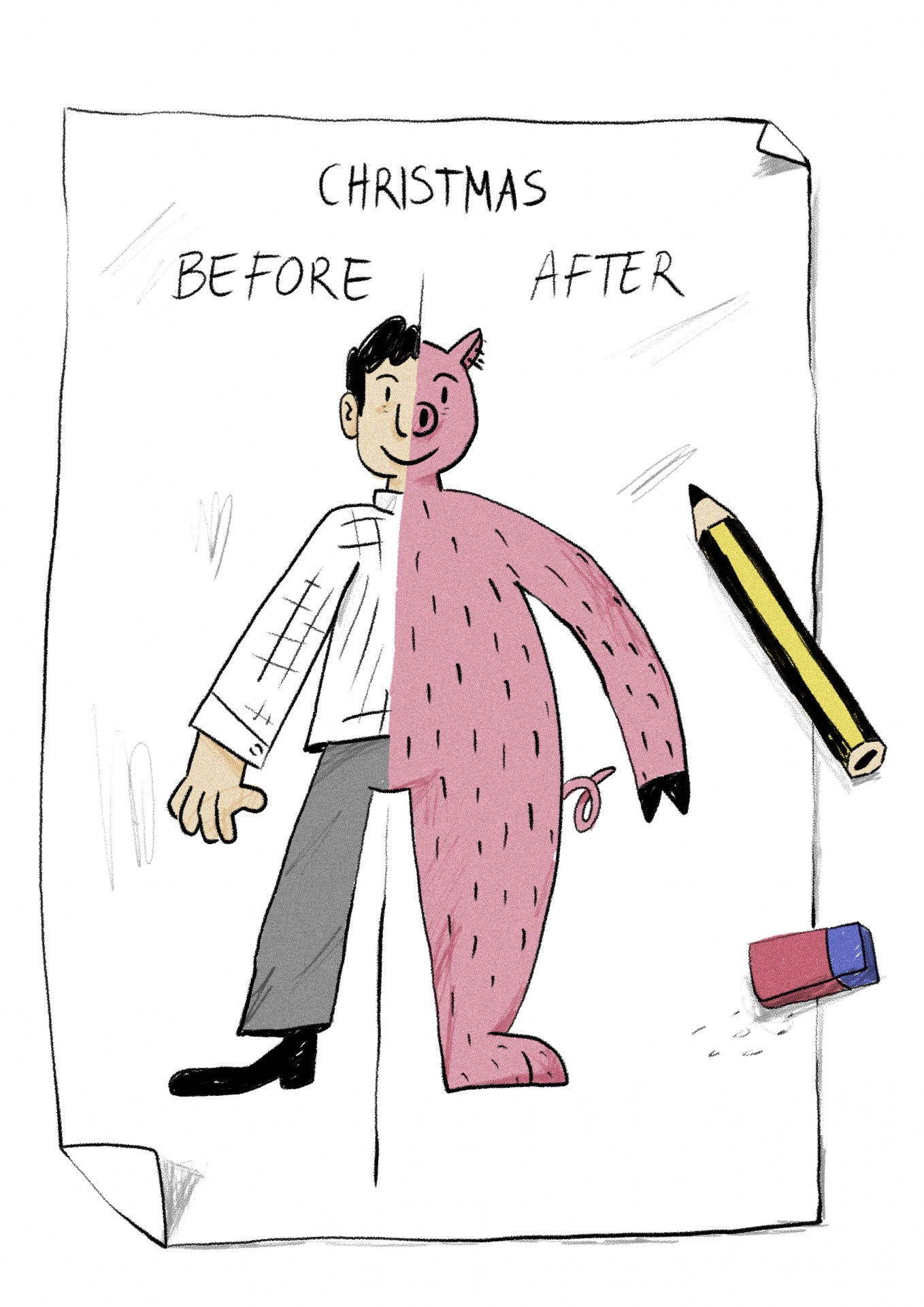 • Desenho dividido ao meio de homem e pessoa com fato de porco rosa numa folha com lápis e borracha