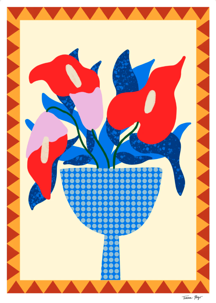 • Ilustração de flores vermelhas e rosas em vaso azul com padrão de bolinhas numa moldura laranja e amarela