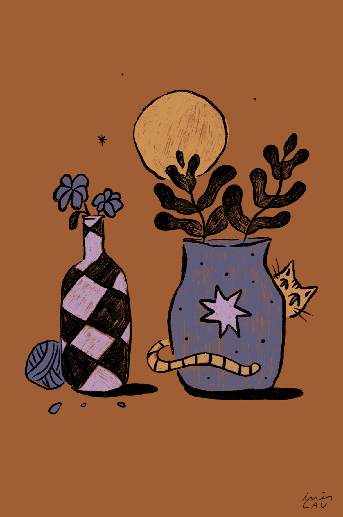 • Ilustração de vasos com plantas, bola de lã e gato amarelo