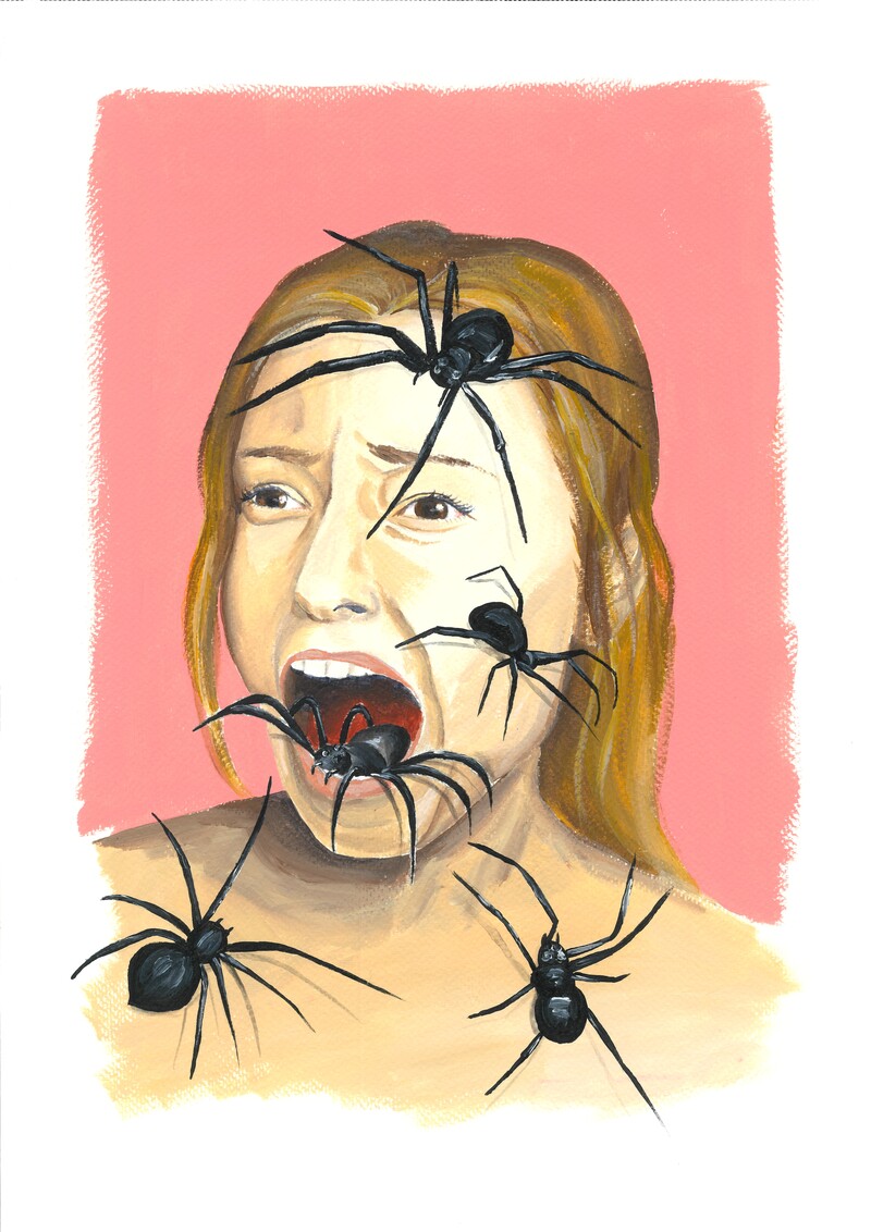 Ilustração de mulher com aranhas pretas no rosto e corpo com fundo rosa