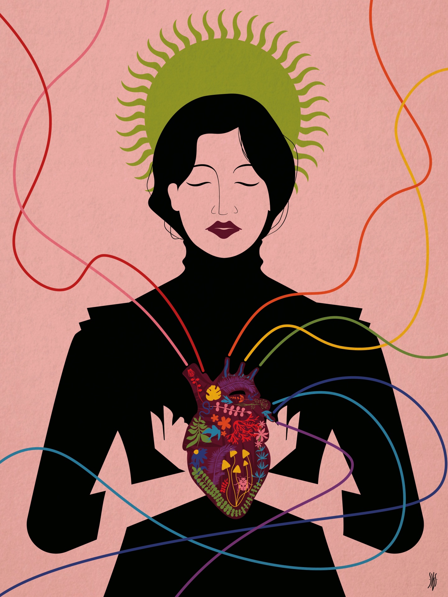 O registo gráco escolhido pauta-se pela sintetização das formas, contrapondo com elementos de cores contrastantes. Figura feminina como elemento cental, em preto, guiando o olhar para o segundo elemento de relevo, o coração, estando este preenchido com elementos botânicos que reunem todas as cores da ilustração.