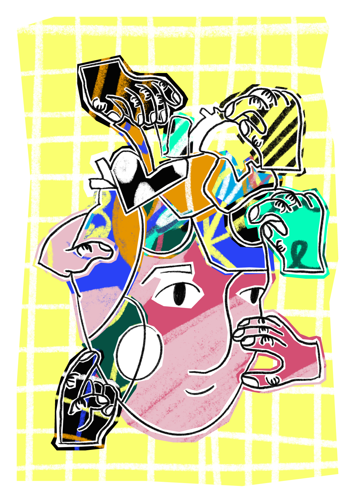Ilustração colorida de cabeça humana estilizada com mãos segurando copos, fundo amarelo com grelha branca