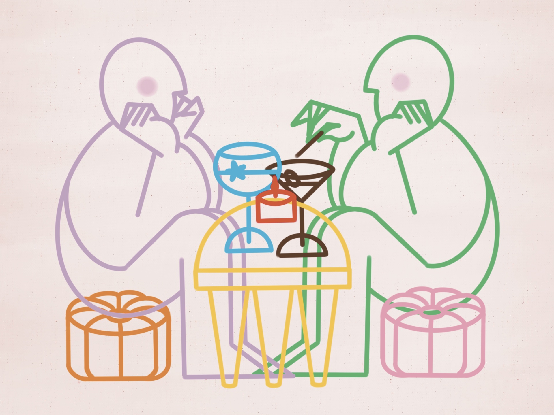 Ilustração minimalista de duas figuras humanas com taças coloridas e uma mesa pequena