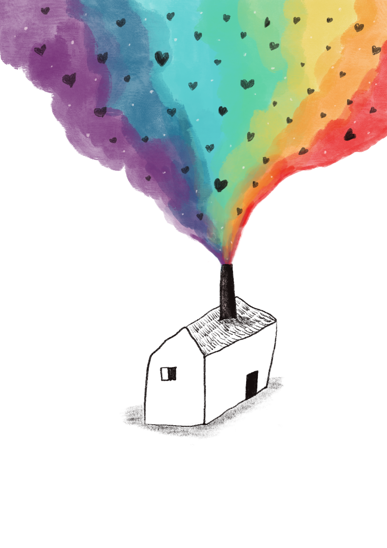 • Ilustração de casa com chaminé emitindo nuvem colorida em arco-íris com corações pretos