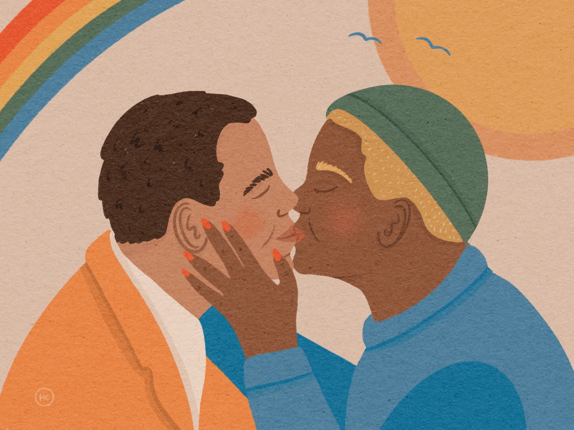 Ilustração de casal a beijar-se com arco-íris e sol no fundo