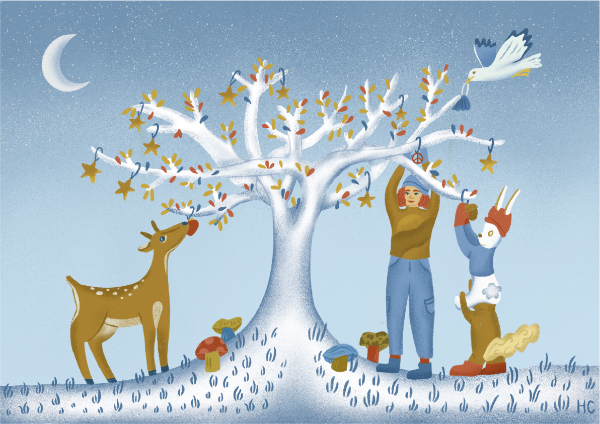 • Ilustração árvore branca com animal e personagens numa paisagem azul à noite